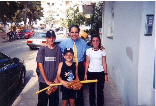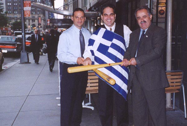 Outside Mickey Mantle's Restaurant coach Dimitri Gousios, Chris and President of the Hellenic Amateur Baseball Federation in Greece Panos Mitsiopoulos.
