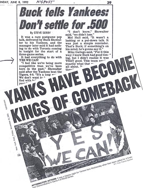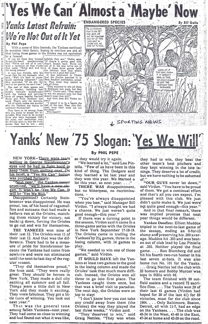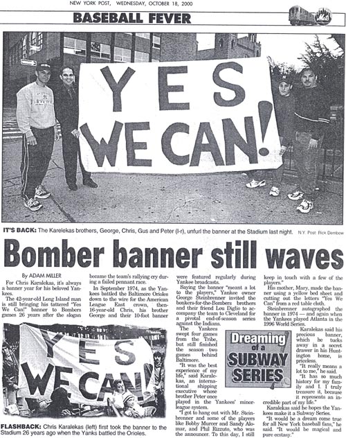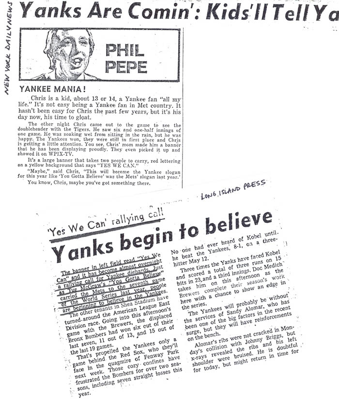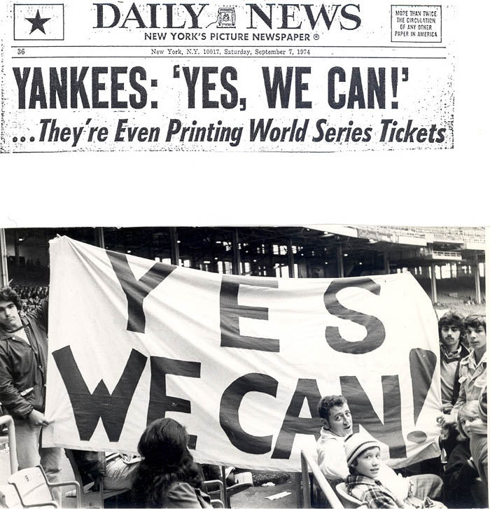 In late September 1974, after many years of never experiencing a pennant race, the Yankees were finally legitimate contenders. One morning, Chris excitedly asked his mom to print words that came to him in a dream after reading about past Yankee championships. He said to himself, “we can win it, yeah, we can win it, yes we can.” So, Chris asked his mom, who was a gifted artist, to put the words: YES WE CAN, on oak tag paper so he can take it to Yankee games at Shea (Yankee Stadium was being renovated in ’74 & ’75). Chris simply wanted to help inspire a spirit and an excitement to rekindle the fan base, which had dwindled considerably since the mid-60. This, mind you, from a 16 year old who studied attendance charts, knew batting averages to percentage points, and who two years later took his transistor radio and earpiece to church in 1976 as he was part of a bridal party…but had to listen to a World Series game in church as his beloved Yankees played the Big Red Machine of Cincinnati.