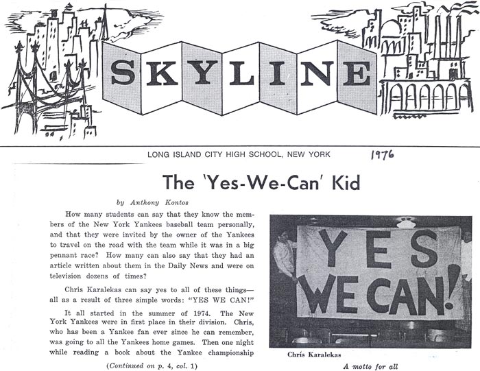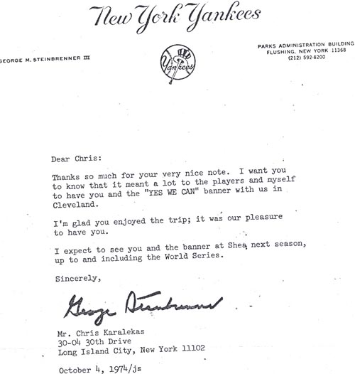 Wearing his maroon Long Island City High School varsity jacket and blue jeans, and with his “Yes We Can” banner tucked under his left arm, he walked up to the table, excused himself and apologized for interrupting dinner. Chris thereafter asked to have a word with Mr. Steinbrenner. As Mr. Steinbrenner began to get up from the table he clearly saw Chris somewhat nervously holding the bright yellow bed sheet of a banner under his arm. Mr. Steinbrenner immediately recognized him and said, “ Hey, you’re the “Yes We Can” kid ! How are you young man?” Exactly 30 years later those moments are frozen in time.